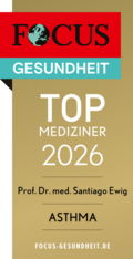 Asthma ist eine außerordentlich häufige Erkrankung. Ca. 5-10% der Menschen weisen ein sogenanntes hyperreagibles (also überempfindliches) Bronchialsystem auf. Asthma ist nicht heilbar, aber 95% der Patientinnen und Patienten mit Asthma können durch eine konsequente Therapie zur Beschwerdefreiheit bzw. - armut ohne Einschränkung der Lebenserwartung geführt werden. Aus dieser Tatsache ergibt sich, dass einer konsequenten Therapie ein hoher Stellenwert für Lebenserwartung und - qualität zukommt. In unserer Klinik wird daher besonderer Wert auf eine gründliche Patientenschulung gelegt.